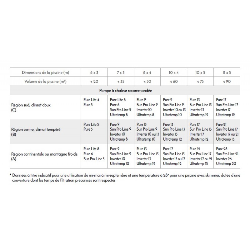 Le tableau ci-dessous vous indique quel modèle Pure Pac choisir pour votre piscine. Notez que ces données sont conditionnées avec l’utilisation d’une couverture durant la nuit (bâche à bulles, volet, abri, bâche à barres, …). Sans système de couverture, la puissance de la pompe à chaleur doit être doublée aux vues des déperditions calorifiques à prévoir.
