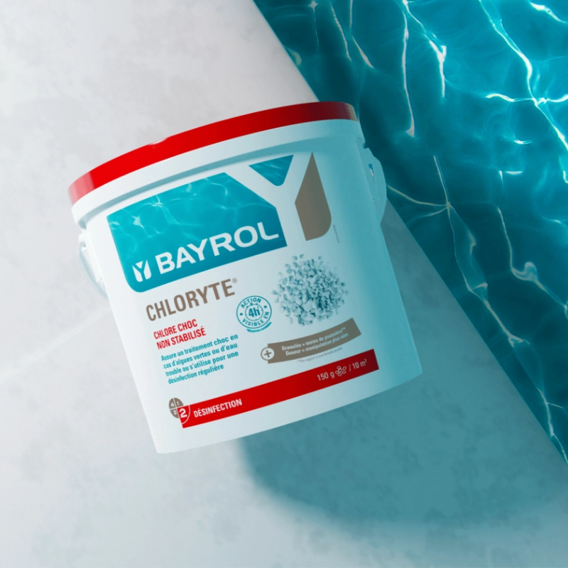 Optez pour le Chlore non stabilisé Bayrol Chloryte, il assure un traitement choc en cas d’algues vertes ou d’eau trouble et s’utilise également pour une désinfection régulière !
